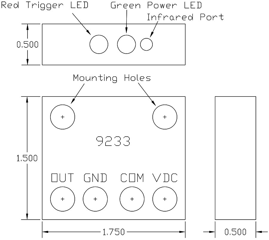 The threshold and axis plane are both set using the Phenix Programmer Software, which is available online for FREE. The software sets the threshold and calibrates the sensing plane. The settings are then transferred from the computer to device using an infrared remote programer, model 9245. The 9233 receives the settings from the remote through the infrared input located on along the side of the device. |